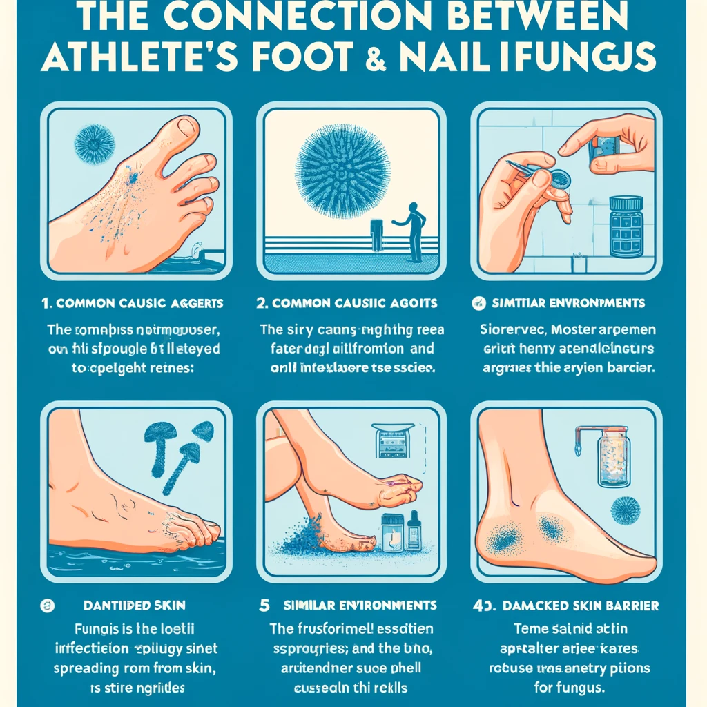 무좀과 손발톱 곰팡이는 공유된 원인 물질과 번성하는 환경으로 인해 밀접하게 관련되어 있습니다. 다음은 이 두 조건 사이의 연관성을 보여주는 몇 가지 주요 사항입니다.